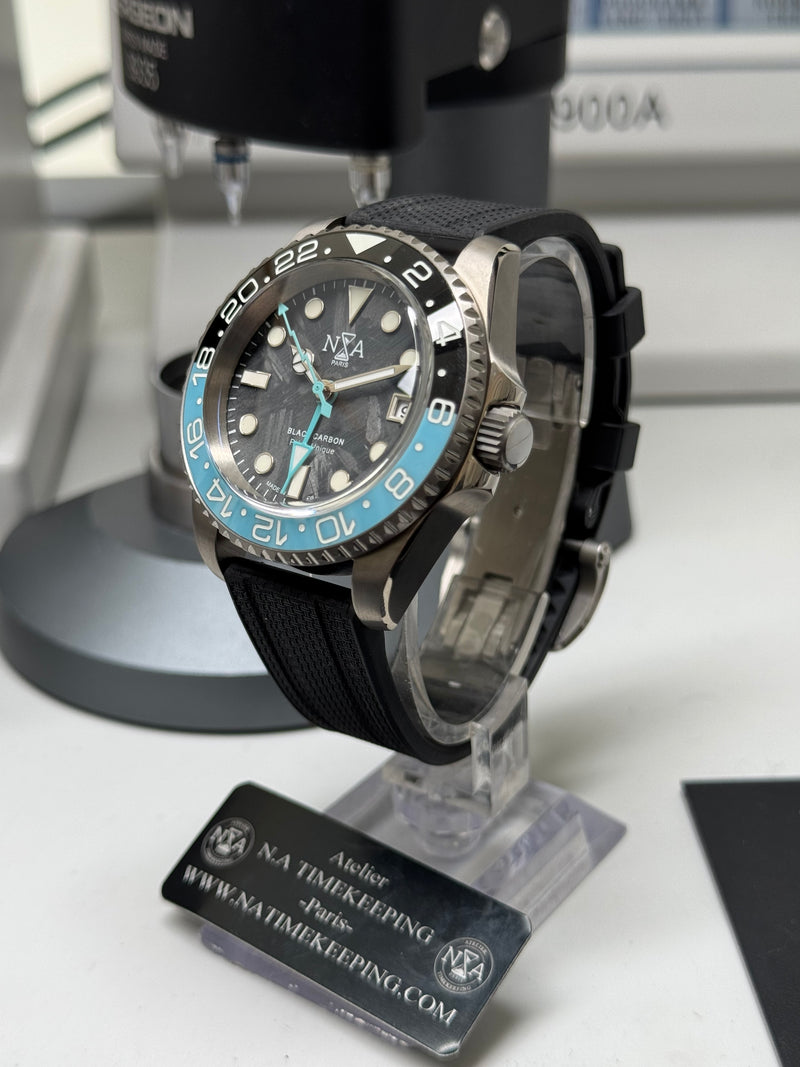 Complications : date, second fuseau horaire GMT, remontage manuel et stop-seconde.