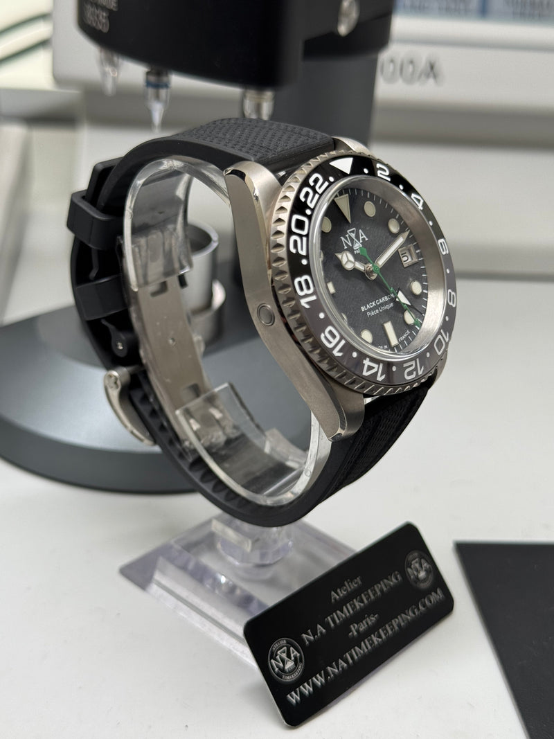 Complications : date, GMT, remontage manuel et stop-seconde.