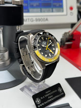Aiguille GMT jaune, haute lisibilité.